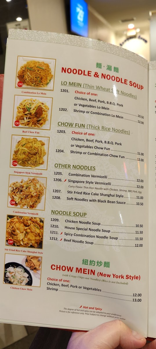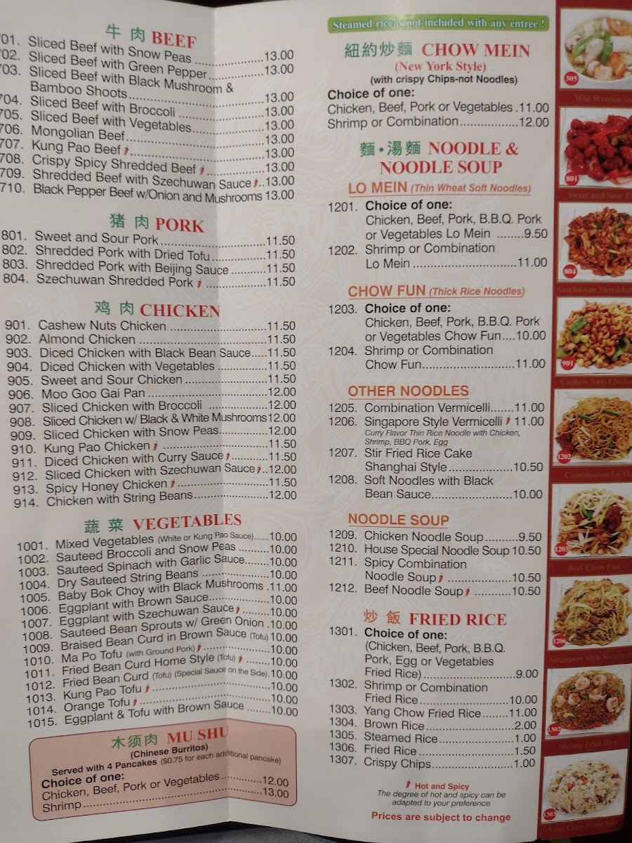 Noodles and Soups include items like Beef Noodle Soup, Spicy Noodle Soup, Wor Wonton Soup, House Pan Fried Noodle, Combination Lo Mein, and Chicken Soup, providing options for lighter meals or comforting broths.