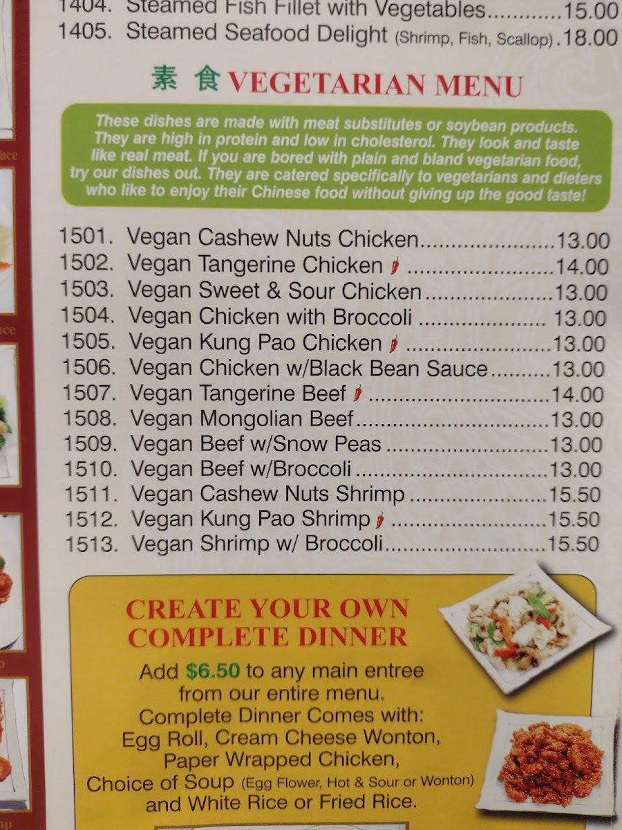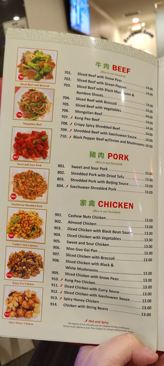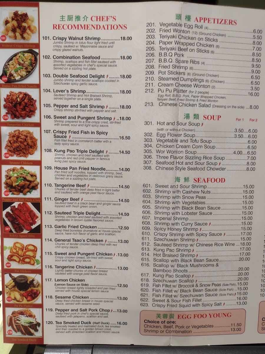 Chicken and Seafood selections feature a range of preparations such as General Tsao's Chicken, Sweet and Pungent Chicken, Garlic Fried Chicken, Crispy Walnut Shrimp, Ginger Beef, Pepper and Salt Shrimp, Combination Seafood, Double Seafood Delight, and other varied stir-fried or fried dishes.